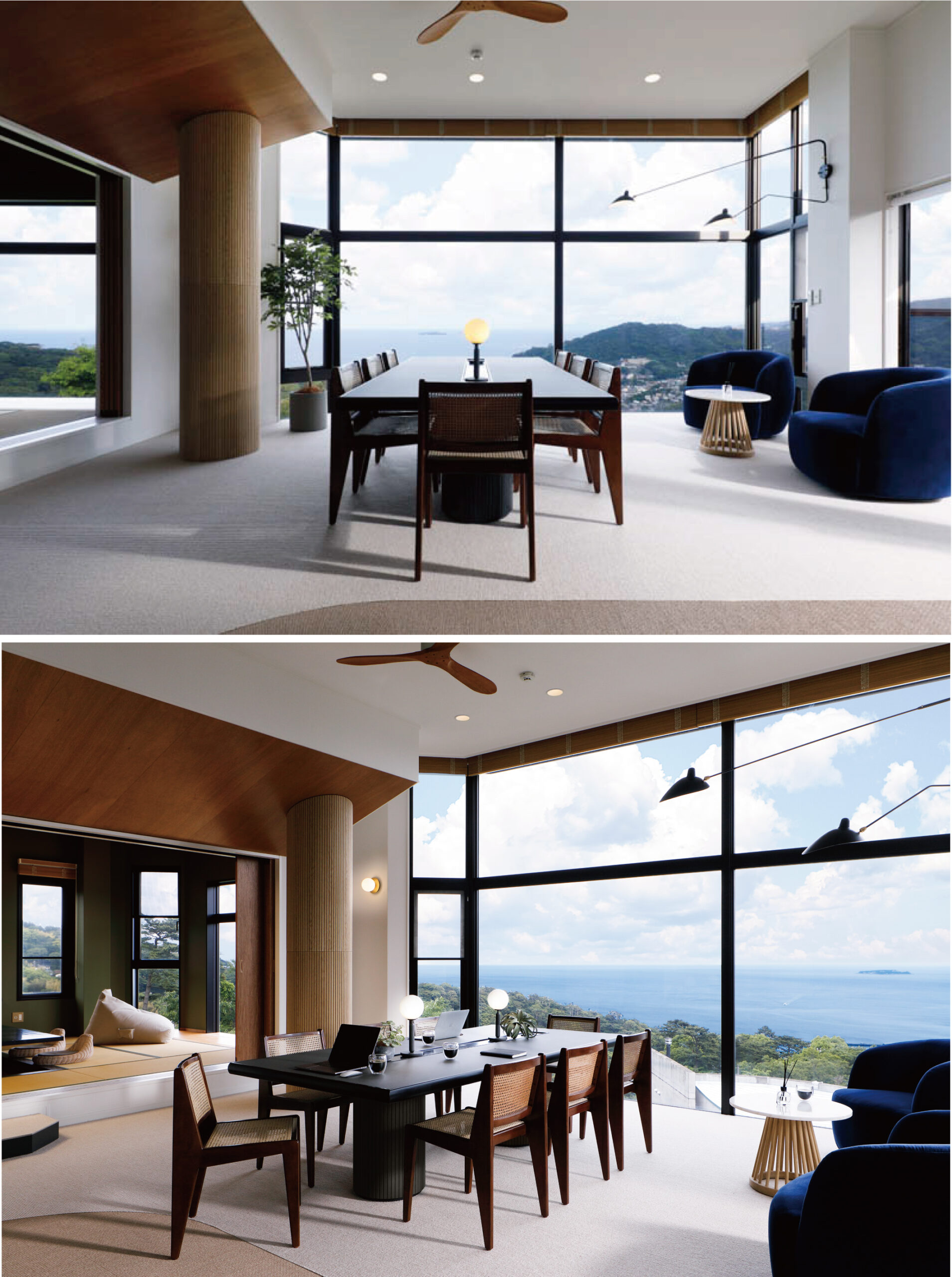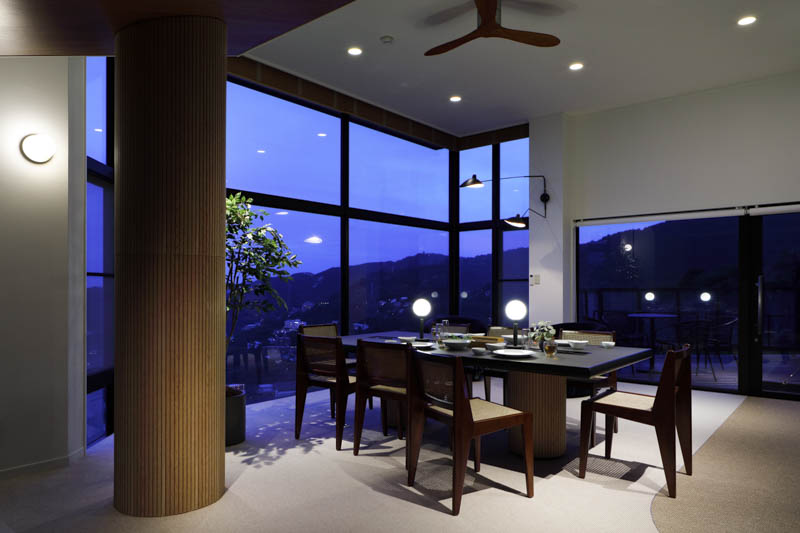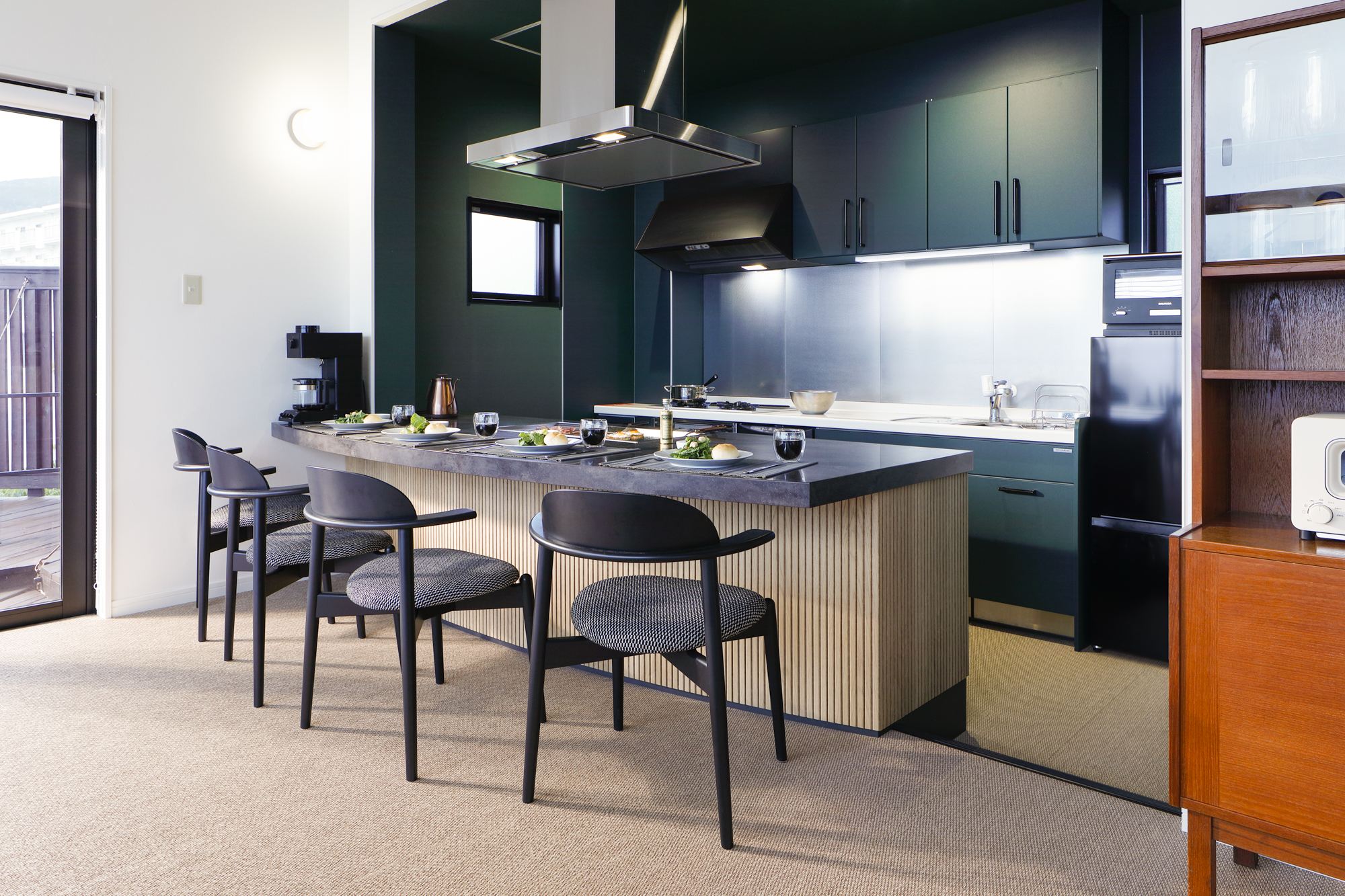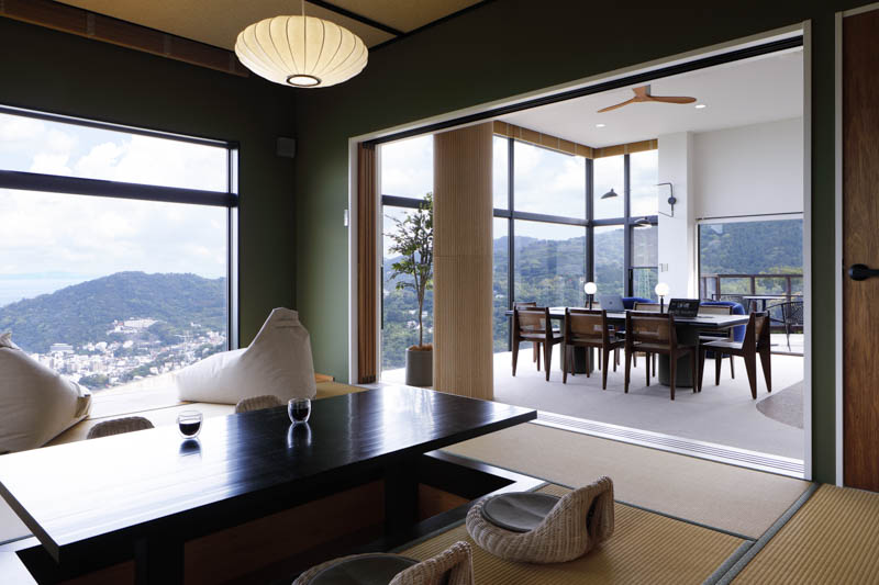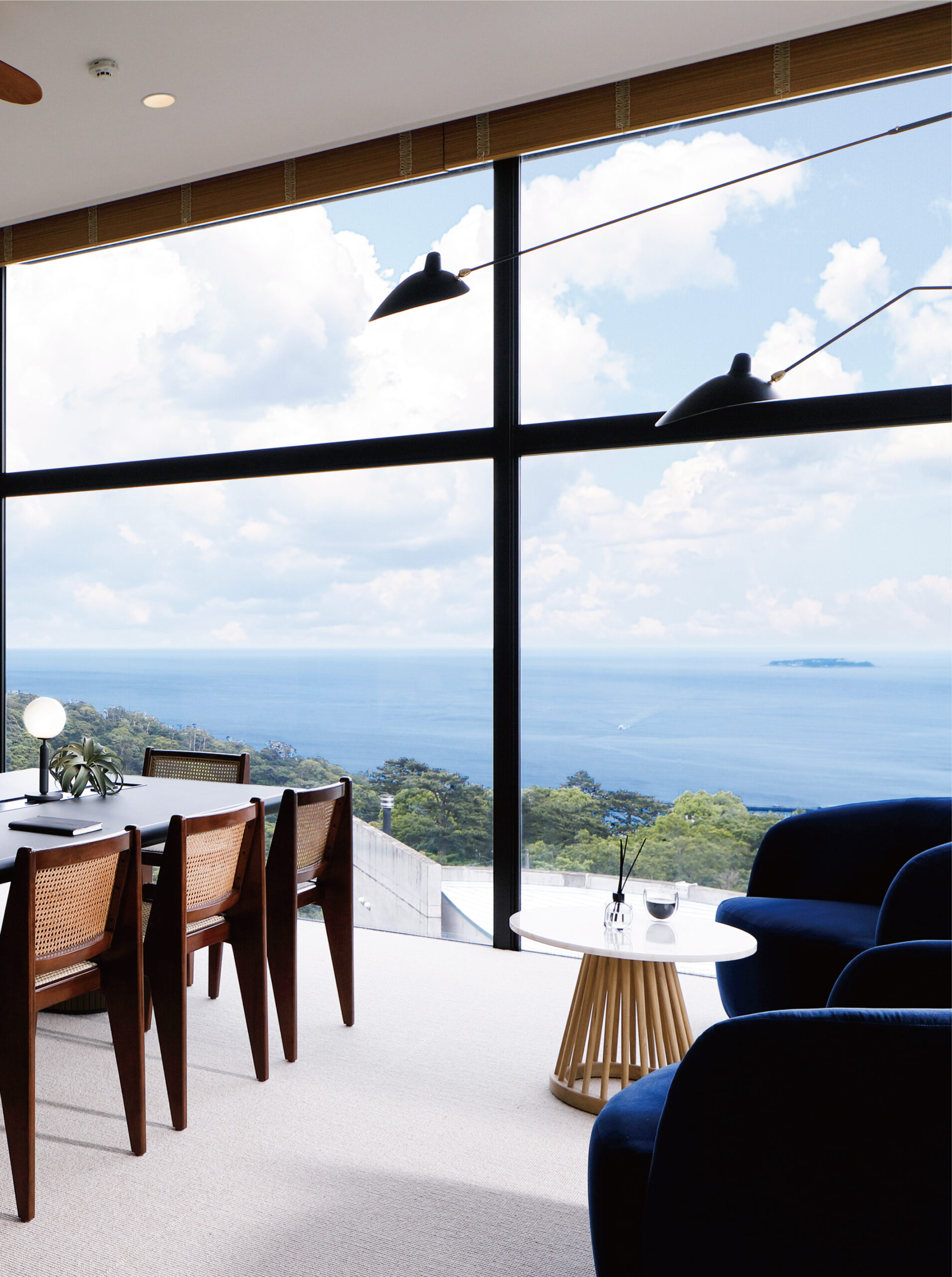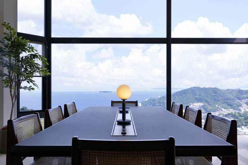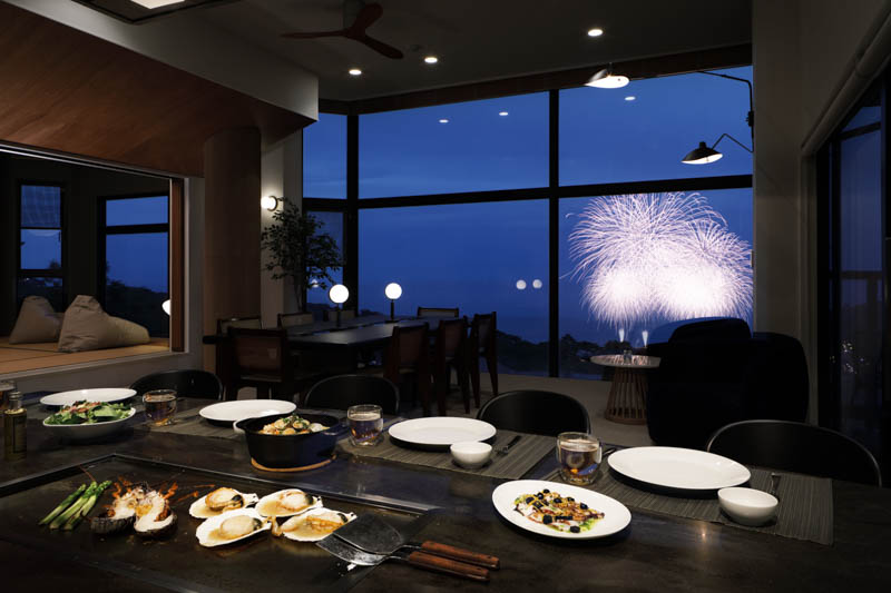 インフィニティバケーションレンタルとして開発された、熱海屈指の高台別荘地に位置するINFINITYは、浴室を含めた全部屋がオーシャンビュー。特にリビングの大きな窓枠からは、きらめく相模湾の左に房総半島、右には緑々しい鷹ノ巣山など180度すべてが絶景。カウンターキッチンに備えられた鉄板グリルで料理をしながら熱海名物の花火とともにスペシャルディナーを体験できます。